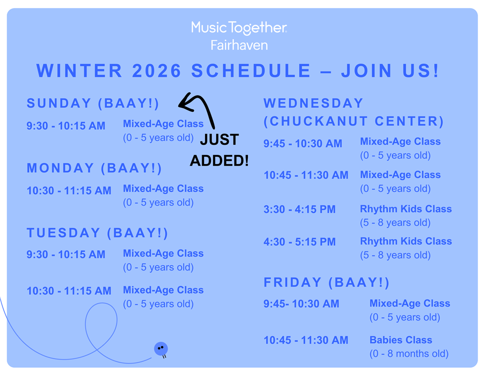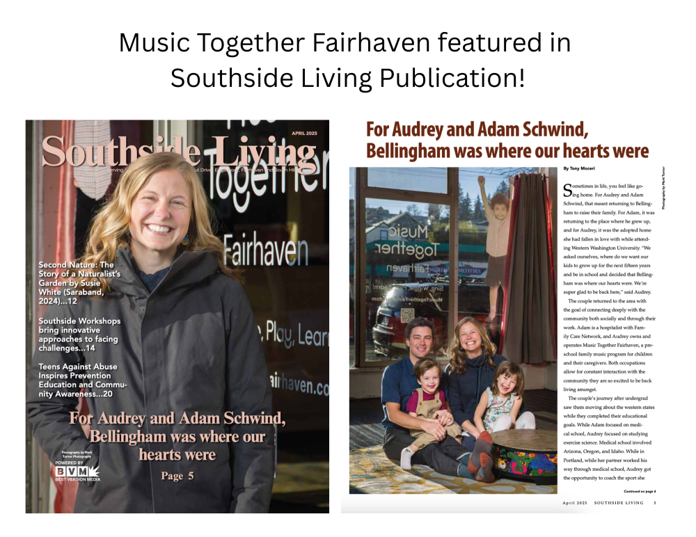 Every week in our music classes at Music Together Fairhaven, babies, toddlers, preschoolers, big kids and the grownups who love them® come together to play together musically. Little ones love playing along in class, and caregivers love being a part of their children’s growth into confident music-makers. And everyone loves our songs that’ll have you tapping along in no time. Music Together® is the perfect family activity in Bellingham's Fairhaven and Downtown neighborhoods.